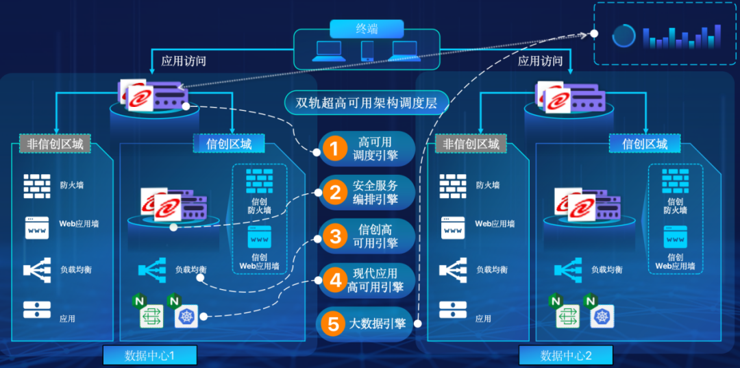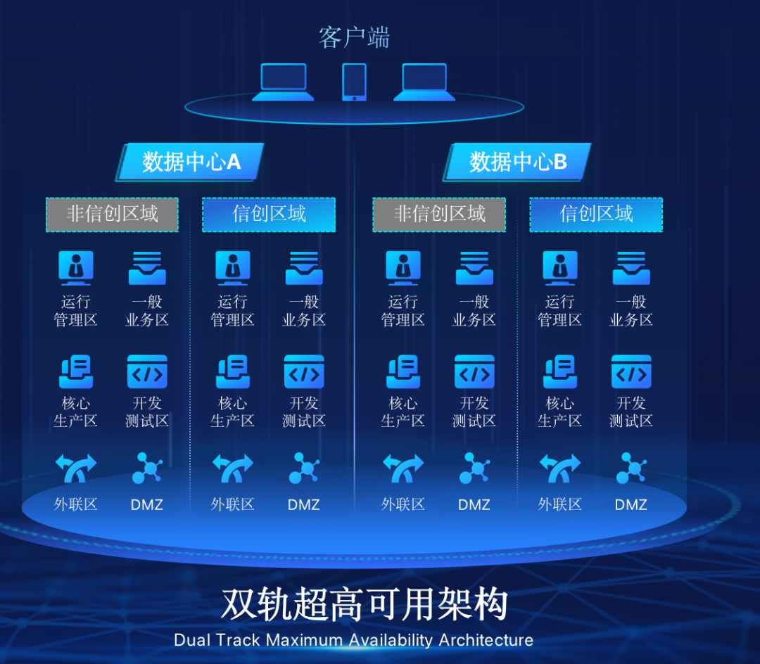 5657威尼斯(中国)在企业面临自主创新IT基础重构过程中,推出的全新架构双轨超高可用架构(简称DTMAA),在双活数据中心的分区调度基础上,添加每个数据中心内信创域和非信创域的分域调度,来实现分区分域协同的多活双轨超高可用。